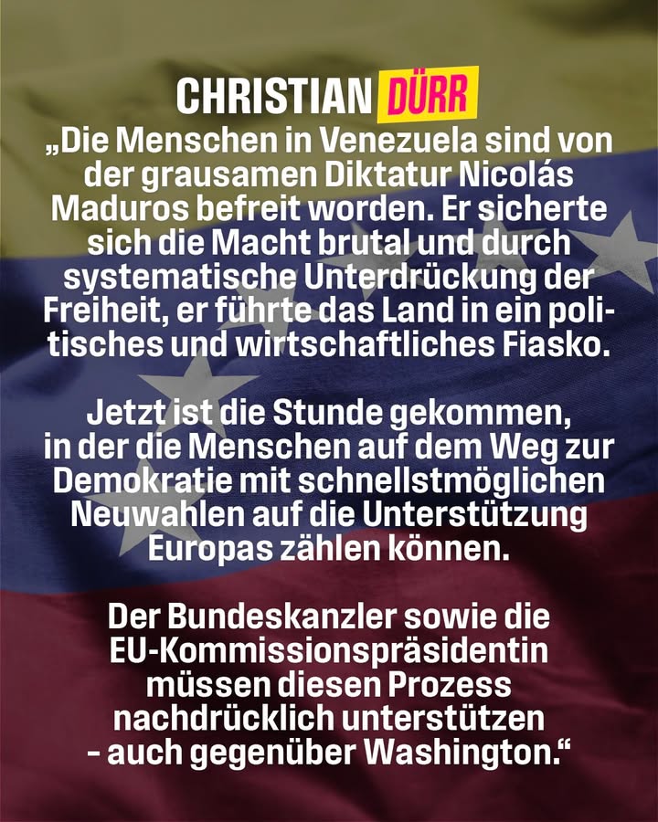Christian Dürr: „Die Menschen in Venezuela 🇻🇪 sind von der grausamen Diktatur Nicolás Maduros befreit worden. Er sicherte sich die Macht brutal und durch systematische Unterdrückung der Freiheit. So führte er das Land in ein politisches und wirtschaftliches Fiasko. Nach einem Übergang sollten in Venezuela schnellstmöglich Neuwahlen unter internationaler Beobachtung stattfinden. Dieser friedliche und demokratische Übergang sollte vom demokratisch gewählten Präsidenten Edmundo González organisiert werden. Jetzt ist die Stunde gekommen, in der die Menschen in Venezuela auf dem Weg zur Demokratie mit schnellstmöglichen Neuwahlen auf die Unterstützung Europas zählen können. Bundeskanzler und EU-Kommissionspräsidentin müssen diesen Prozess nachdrücklich unterstützen – auch gegenüber Washington. Während Deutschland und Europa über die völkerrechtliche Dimension diskutieren, ist eines glasklar geworden: Unser Einfluss als Europäer, als Deutsche in internationalen Konflikten, ist unmittelbar mit unserer ökonomischen Stärke verbunden. Wenn wir uns wirtschaftlich weiter schwächen, werden wir immer mehr zum Kommentator denn zum Akteur. Ob wir jetzt endlich echten Reformmut bei uns zuhause haben und damit wieder wirtschaftlichen Erfolg ist keine rein innenpolitische Frage! Im Gegenteil: unser ökonomisches Gewicht ist unmittelbar mit unserem geopolitischen verbunden.“
